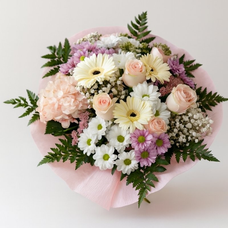 Cada flor aporta su propia personalidad: las rosas simbolizan cariño y admiración, las margaritas frescura y sencillez, las hortensias elegancia y volumen, y las gerberas un toque alegre y moderno. El resultado es un ramo que transmite amor sereno, dulzura y positividad, perfecto para cumpleaños, aniversarios, nacimientos o cualquier momento especial.
