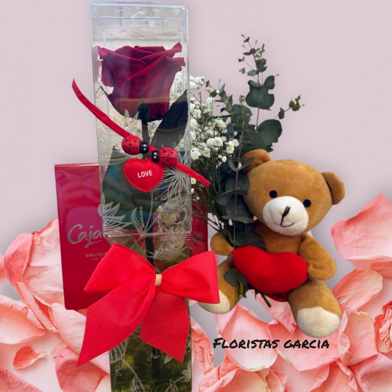 Pack especial.Incluye: rosa eterna en color rojo+ peluche + caja de bombones + ramillete.