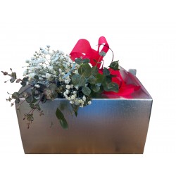 Todo va dentro de una caja de cartón plateada , con decoración especial de san Valentín.